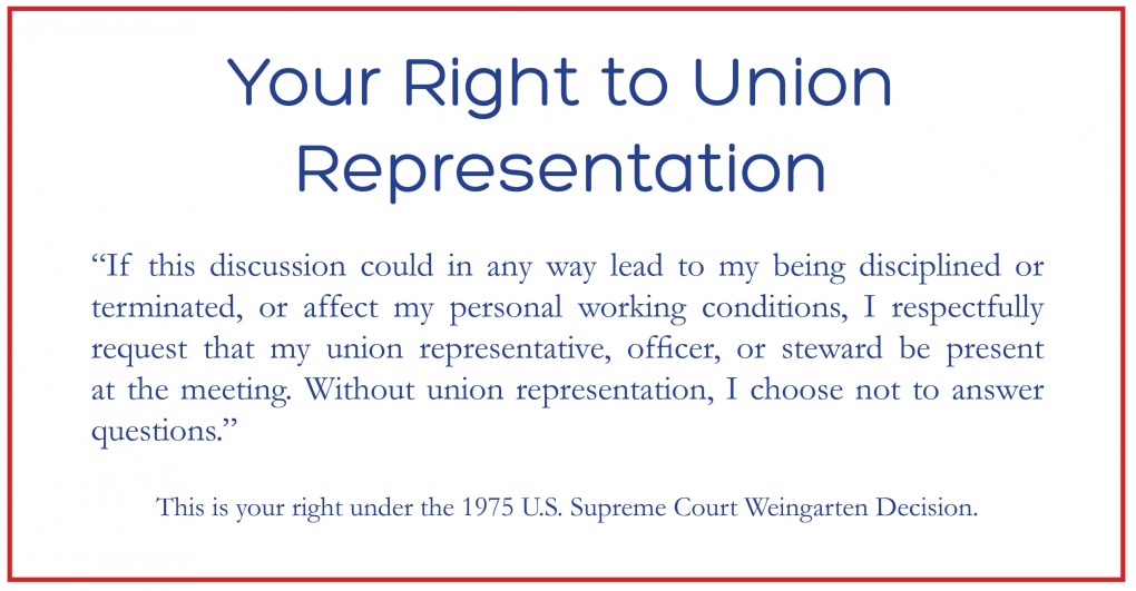 Rule 1) – You must make a clear request for effective union representation before or during the interview. Often an employee may not know at the outset that a meeting with management could lead to discipline. If such a meeting is or becomes an “investigatory interview,” you should assert your right to have a union officer of your choosing present. You cannot be punished for making this request. (Note: If the union representative of your choice is not available in a reasonable time period, it may be necessary for an alternative union officer to represent you.)