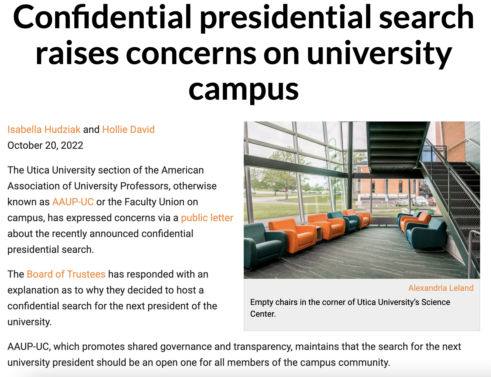 On October 20, 2022, the Utica University Student-Run News Source, The Tangerine, reported on the AAUP-UC’s October 16, 2022 open letter urging the Board of Trustees to reconsider their decision to conduct a confidential search for the next Utica University president and conduct an open and fully transparent final selection process. The Tangerine article includes Bob Brvenik’s response to the AAUP-UC letter as well as the Utica University Faculty Senate’s resolution stating that the response by the Board of Trustees did not “adequately address the concerns raised by the AAUP-UC.”