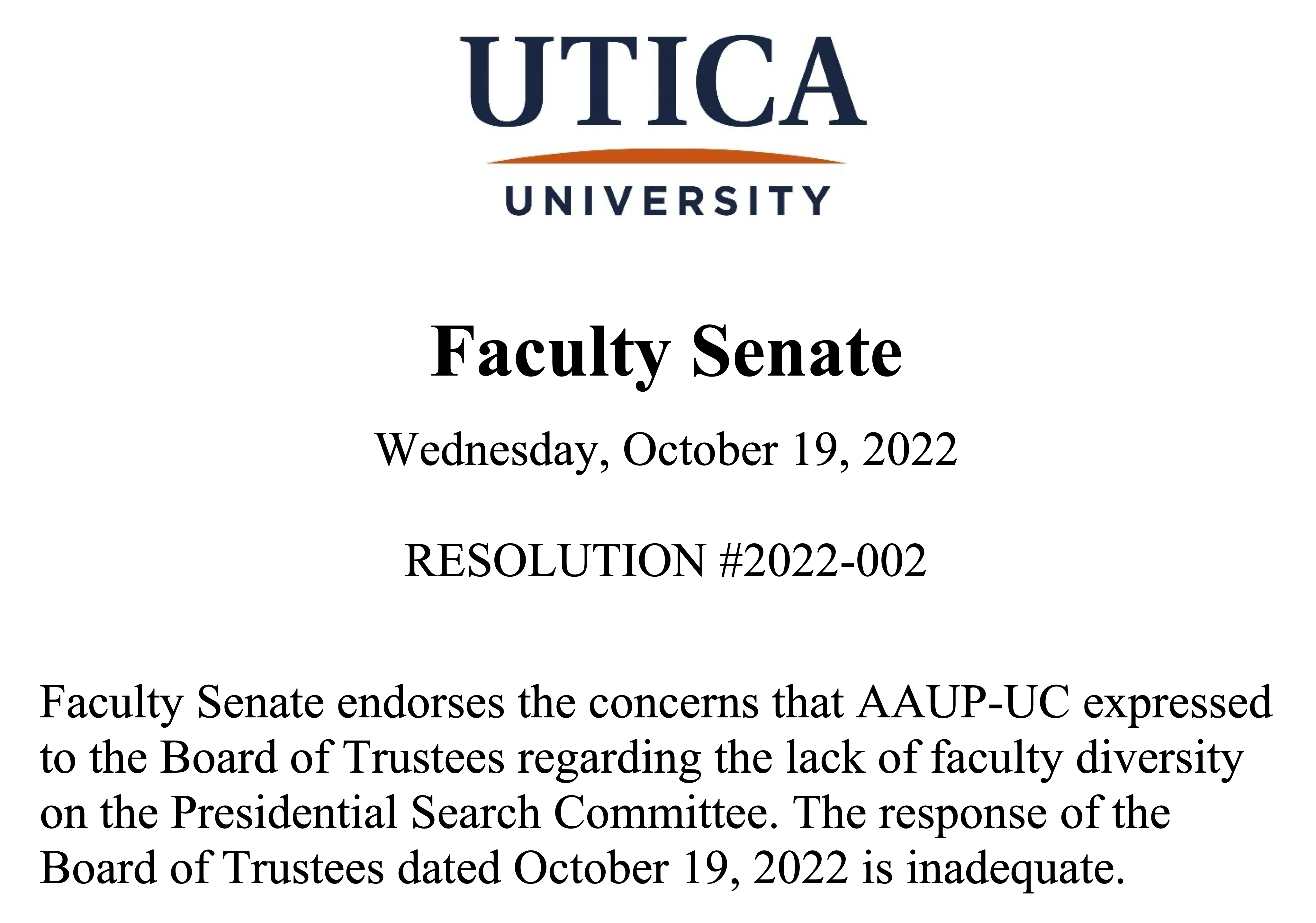 The Utica University Faculty Senate endorses the October 16, 2022 AAUP-UC Open Letter to the Chairperson of the Presidential Search Committee. The response by the Chairperson of the Board of Trustees dated October 19, 2022, does not adequately address the concerns raised by the AAUP-UC.