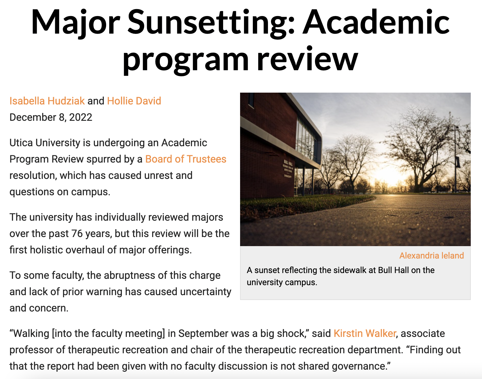 On December 8, 2022, the Utica University Student-Run News Source, The Tangerine, reported on the Academic Program Review at Utica University, “spurred by a Board of Trustees resolution, which has caused unrest and questions on campus.”