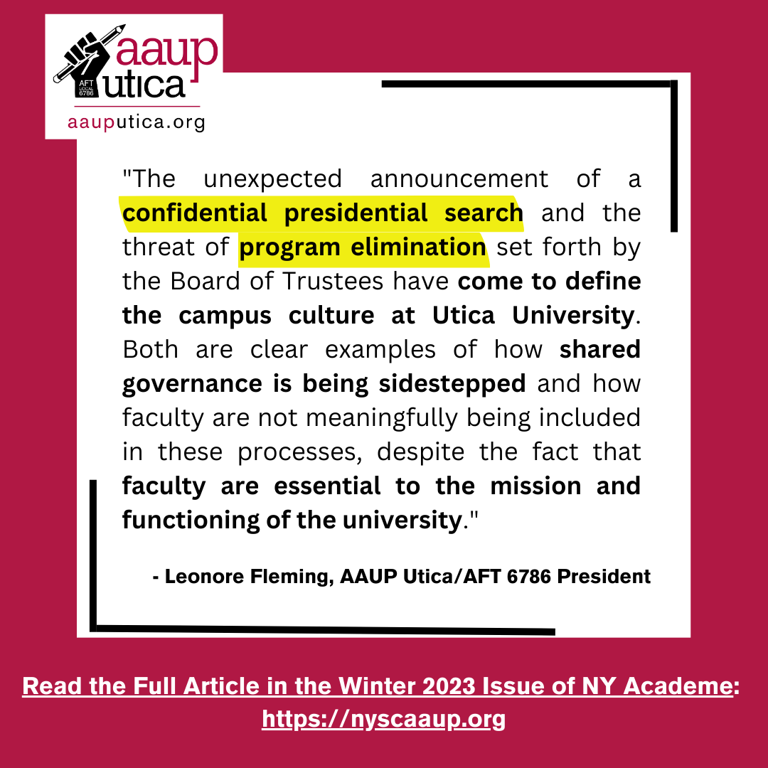 The newest issue of NY Academe, VOL 46, No 4, Winter 2023, includes the article “Confidential Presidential Search Underway at Utica University” written by AAUP Utica/AFT 6786 President Leonore Fleming. Among other things, the article includes a timeline of events from October 2022 under the section titled “A Timeline of Shared Governance in Decline.”